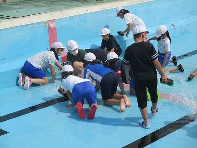 全校除草とプール清掃を実施 5月20日(金)、5,6校時に全校除草(1~4年生・1年生は石拾い)とプール清掃(5,6年生)を行いました。熱い中でしたが、水分を補給しながらどの学年も一生懸命に取り組みました。校庭ではたくさんの草や石が除かれ、プールは見違えるようにきれいになりました。特にプール清掃は2時間続きで、プールの中だけでなく、プールサイドや更衣室等も清掃したので大変でしたが、よく頑張ってくれました。これで今年もしっかりと水泳の授業ができそうです。
