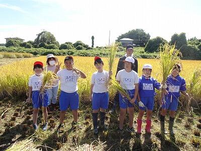 1学期に田植えをさせていただいた田んぼで、今度は稲刈り体験をさせていただきました。お話を伺い、米作りの工夫や努力を学ぶとともに、地域ボランティアの方にお手伝いいただきながら、稲刈り用の鎌を使って、豊かに実った稲穂を刈り取り、お米を収穫する貴重な体験となりました。ボランティアの皆様、大変ありがとうございました。