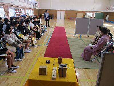 地域ボランティアの皆様のお陰で、6年生が、お抹茶をいただく体験を実施させていただくことができました。コロナ禍の3年間、地域ボランティアの皆様は、この日のために、定期的に集まってお抹茶を点てる練習をしてくださっていたそうで、本当にありがたいことです。初めての練り切の和菓子の上品な甘さとお抹茶のほろ苦さの絶妙な味わいに舌鼓を打ち、日本の伝統文化の一端を学ぶ貴重な体験となりました。ボランティアの皆様の着物姿も素敵でした。心より感謝申し上げます。