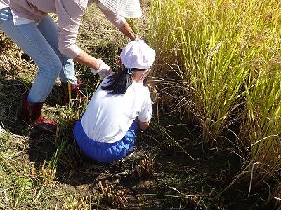 1学期に田植えをさせていただいた田んぼで、今度は稲刈り体験をさせていただきました。お話を伺い、米作りの工夫や努力を学ぶとともに、地域ボランティアの方にお手伝いいただきながら、稲刈り用の鎌を使って、豊かに実った稲穂を刈り取り、お米を収穫する貴重な体験となりました。ボランティアの皆様、大変ありがとうございました。