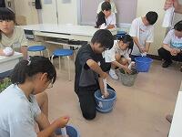 汚れた雑巾をバケツの水で洗うときは、「ふり洗い」「こすり洗い」で汚れを落として、「たてしぼり」でかたく絞ります。全員、とても上手に雑巾を使うことができました。