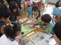 生活科「きれいにさいてね」の授業では、今育てている朝顔の鉢植えから、予め摘み取っておいたしぼんだ花びらを使って色水を作り、折り曲げた半紙に付けて模様作りをしました。みんなで、赤紫や青紫のきれいな色合いを楽しみました。