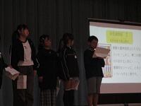 図書委員全員がステージ上で、各自のおすすめの本を紹介したり、本から考えたクイズを出題したりしました。クイズの答えは全校生で考え、正解が伝えられる度に、歓声があがり、楽しい集会となりました。