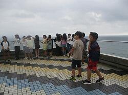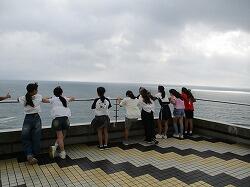 2日目の朝、外のデッキで、みんなで海を眺め、記念写真を撮りました。