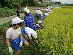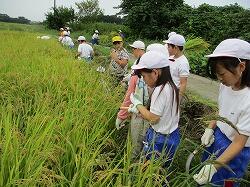 本日1・2校時に5年生が、今年も、赤麻地区の方のご好意で、学校近くの田んぼで稲刈り体験をさせていただきました。5月に田植え体験をさせていただいた稲です。