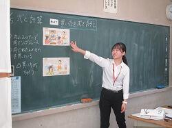 「式と計算」の授業で、買い物の場面を想定し、その買い方を式に表す授業展開でした。