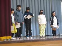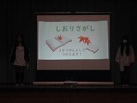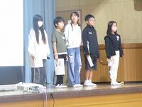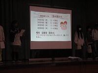 それに伴い、体育館で図書委員による読書集会が行われました。はじめに、読書旬間イベントの「親子読書」や「しおり探し」「図書委員による読み聞かせ」についての説明を行い、次に、図書委員が一人ずつ自分のおすすめの本を紹介し、最後に、図書室クイズを行いました。