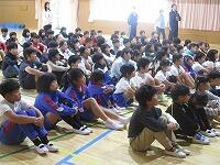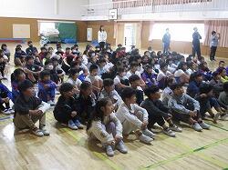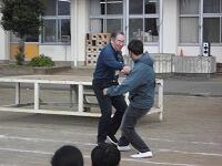 また、6年生が、不審者に腕を捕まれたら、腕をくるっと回転させると手が離れることを実演してくれました。子供たちは、スクールサポーターさんの説明をよく聞いていました。