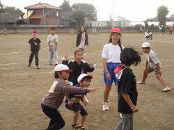 タグラグビーは接触がなく、安全に楽しく行えるゲームとして注目されています。タグラグビーには、サッカーやバスケットボールのようなゴール型ゲームと異なり、①ボールを持ったまま移動できる、②中央にシュートするという課題がない(端でも得点できる)という特徴があります。そのため、1・2年生の体育で行う「鬼遊び」などで学んだことからプレイでき、子どもたちは難しい技術を使わずに楽しむことができています。