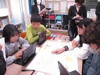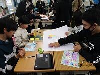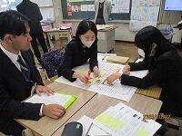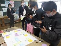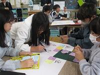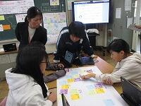 子供たちの学びの様子を記入した付箋紙を模造紙に貼りながら、意見交換を行い、授業の中で子供たちがどのように学んでいたのかを確認しました。そして、有効な手立てなどを確認しました。