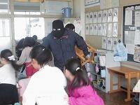いよいよ訓練開始です。スクールサポーターの方が、覆面をして教室に入ってきました。