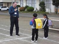 1~3年生の代表各2名が、実際にランドセルを背負って、登下校の場面を想定して実演しました。不審者が近寄ってきたら、捕まらないように距離をとって逃げること、「たすけてー」と大きな声で叫ぶこと、防犯ブザーをならすことなどのポイントを学びました。