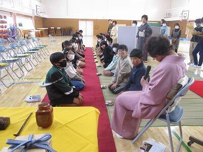 10月25日6年生が4年ぶりに抹茶体験をさせていただきました。 投稿日時 : 2024/01/27 赤麻小管理者 地域ボランティアの皆様のお陰で、6年生が、お抹茶をいただく体験を実施させていただくことができました。コロナ禍の3年間、地域ボランティアの皆様は、この日のために、定期的に集まってお抹茶を点てる練習をしてくださっていたそうで、本当にありがたいことです。初めての練り切の和菓子の上品な甘さとお抹茶のほろ苦さの絶妙な味わいに舌鼓を打ち、日本の伝統文化の一端を学ぶ貴重な体験となりました。ボランティアの皆様の着物姿も素敵でした。心より感謝申し上げます。 {{options.likeCount}} {{options.likeCount}}