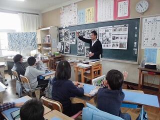 4年生になると、図工の時間、初めて木版画に実施します。つまり、初めて彫刻刀に挑戦です。新里教材の嶋田さんを講師に迎え、彫刻刀の基本的な使い方を教えていただきました。