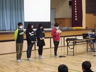 始業式では校長先生の話に続いて、1年生と5年生の代表児童が3学期のめあてを発表しました。校歌の伴奏も5年生にバトンタッチです。