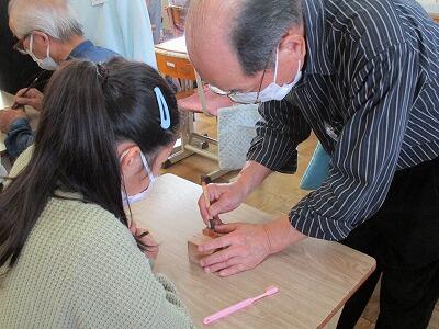 6年生が落款づくりを体験 10月14日(木)、6年生がものづくり体験教室で落款づくりを体験しました。「日本の伝統文化やものづくりのすばらしさ、楽しさを感じることができるようにする」というねらいの元、総合的な学習の一環として行いました。講師として栃木市印章彫刻技師会の4名の方をお招きしました。初めに落款の歴史や製作の仕方をDVDで視聴し、講師の方の説明を聞いてから実際の製作に入りました。石に自分の名前の漢字のうち、自分で決めた一文字(篆書体)を掘りました。DVDを見た感じではかなり難しそうでしたが、6年生の子どもたちは堀り方のこつをよく聴いて、集中して製作に取り組み、全員完成させることができました。子どもたちからは「難しかったけど楽しかった」「ていねいに教えてもらって、完成できたのでよかった」等の感想が聞かれました。この落款は卒業アルバムに載せられます。