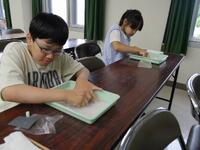 子供たちは、保護者の方と一緒に、自分の名前を、はがき程の大きさの紙に、己書のスタイルで自由に書いて楽しみました。