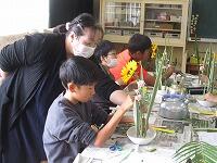子供たちは、真剣な表情で、思い思いに、花の茎や葉をはさみで切って長さを調整したり、剣山に刺す際に角度や向きを変えたりして、作品作りを楽しんでいました。