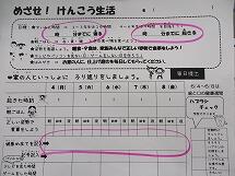 今週末に、「就寝時刻」・「起床時刻」・「健康めあて」を家族と一緒に考えてくる宿題が出ています。