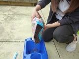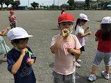 1年生は、生活科の時間に水遊びをしました。牛乳パックを利用して「的」を作り、ペットボトルキャップに穴を開けて「水鉄砲」にしました。どうやったら的が倒れるのか、友達たちと話しながら考えていました。みんな笑顔になった水遊びでした!