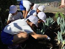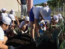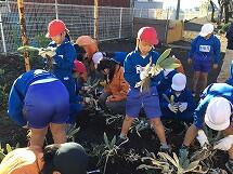 子どもたちは、優しい高校生の皆さんが教えてくれる中、地域の特産物である“宮ねぎ”の栽培ができることに大喜び絵文字:笑顔楽しみながら、宮ねぎの植え方を学ぶことができました。