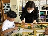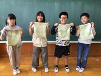 先週、地域の方に教えていただきながら摘んできた「さしもぐさ」の葉っぱを使って、しおり作りをしました。子どもたちは、約1週間、辞書に葉っぱをはさんで「押し花」のように「押し葉」を作っておきました。