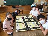 建物の名称を覚えたり、道案内の言い方を覚えたりしています。教室全体を広く使用し、街に見立てて練習開始です!