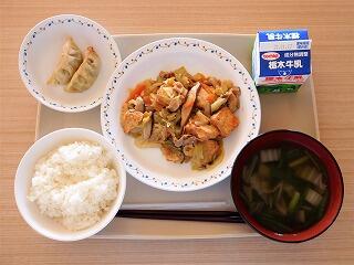 今日の給食は、ごはん、牛乳、ジャージャン豆腐、焼きぎょうざ、にらのピリ辛スープです。