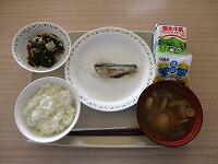 今日の給食は、わかめご飯、牛乳、サバのスタミナ焼き、白菜のおひたし、豚汁です。