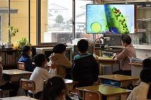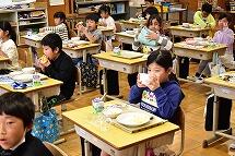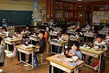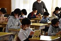 今月も給食の時間に「聞く読書」を実施し、校長先生と教務主任の先生が本の朗読をしました。