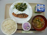 栃木市産のお米を使ったごはん、さつまいもを使ったさつまいも汁、もやしを使ったお浸し、