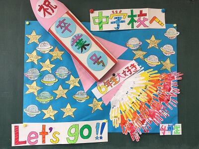 掲示物のテーマは、宇宙です。6年生に「中学校という新しい世界に出発してほしい!!」という4年生の思いが込められています。きっと、6年生へ4年生の思いが届くはずです。