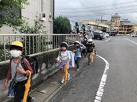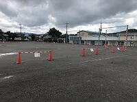 子どもたちが下校します。千塚小では校舎北側の正門を通って登下校する子が多いので、昇降口前に整列しています。下校班で並ぶ時に、どうしても“密”になってしまうので、技能員の先生が、石灰でラインを引いてくださいました。これを目印に、「間隔を開けて並び、話をしない」を徹底します