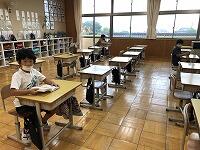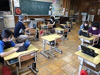 「えのき学童」の子どもたちの人数が多いので、午前中は5・6年生の希望者が校舎内の家庭科室を利用しています。感染症の急拡大への対応として、部屋を分散させるための対策です