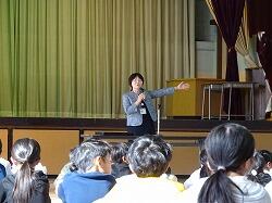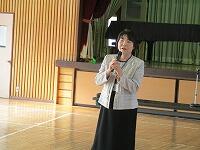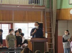 連絡(事務主任の先生・教務主任の先生)※これは保護者の方だけが体育館に残り、6年児童は各授業体験の教室へ移動しました。