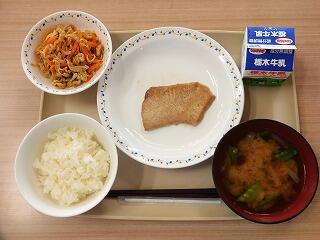 今日の給食は、ごはん、牛乳、カツオの揚げ煮、こまつなのレモン和え、根菜のごま汁です。