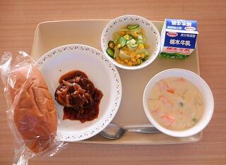 今日の給食は、ごはん、そぼろ丼の具、牛乳、栃木県産豚肉コロッケ、キャベツのみそ汁です。