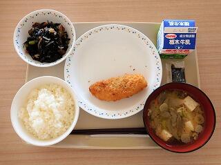 今日の給食は、ごはん、ひじきごはんの具、牛乳、白身魚フライ、豚汁です。