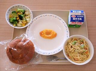 今日の給食は、ミニハチミツパン、牛乳、春野菜のクリームスパゲティ、トマトミートオムレツ、ブロッコリーとカリフラワーのサラダです。
