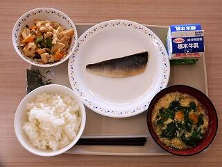 今日の給食は、ごはん、たけのこご飯の具、牛乳、マホッケの塩焼き、にら玉汁です。