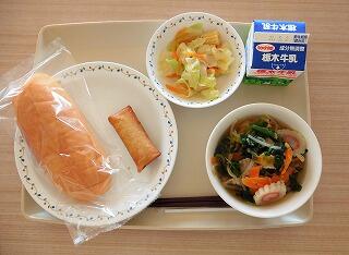 今日の給食は、ミニミルクパン、牛乳、醤油ラーメン、春巻き、中華サラダです。
