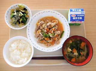 今日の給食は、ごはん、牛乳、モロのスタミナ焼き、切り干し大根の煮物、じゃがいもとさやえんどうのみそ汁です。