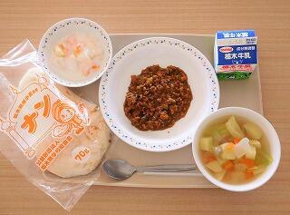 今日の給食は、ナン、キーマカレー、牛乳、野菜スープ、フルーツヨーグルトです。