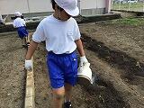 協力して、苗植えを行いました熱い日差しに負けず、名人たちは苗を一つ一つ丁寧に植えることができました。忘れずに水やりも行いました