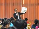 校長先生からは、校長先生が子どもの頃食べていた給食や、「頂きます」「ご馳走さま」の意味についてのお話がありました。バナナが楽しみなデザートだったという話に、子どもたちはびっくりしていました