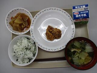 (五目ごはん、牛乳、モロの竜田揚げ、ゆばのすまし汁、県民の日ゼリー)