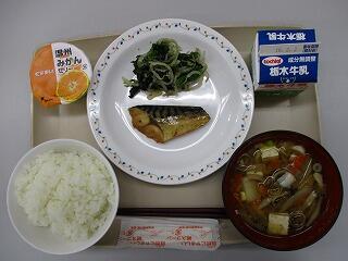 ☆(千塚小リクエストメニュー)ごはん 牛乳 さばのスタミナ焼き 磯香和え いなか汁 みかんゼリー☆