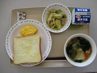 ☆シュガートースト 牛乳 オムレツ もやしとベーコンのソテー ワンタンスープ☆