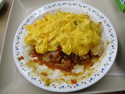 今日は親子丼です。親子丼の具をごはんにのせていただきます!学校給食は、食中毒予防のため、中心温度75度1分以上の加熱をして提供する事が基本のため、卵はかために仕上げています。