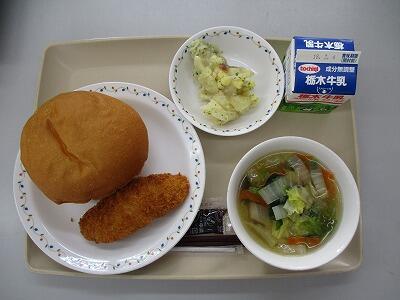 ☆ごはん 牛乳 コロッケ 野菜のカレーソテー ぎょうざスープ(皆川城東小・皆川中学校はバーガーパン)☆